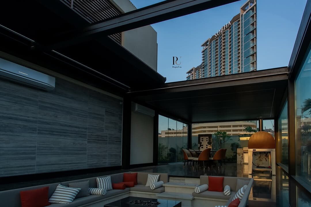 Open-air lounge area. Modern design shines. Striped cushions add comfort. Red accents pop against neutral tones.