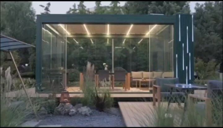 Modern glass-enclosed gazebos blend nature with comfort. This design shines in outdoor spaces. Wooden frames provide strength and warmth. Light-colored seating invites relaxation. A small table encourages gatherings, ideal for tea or chats.