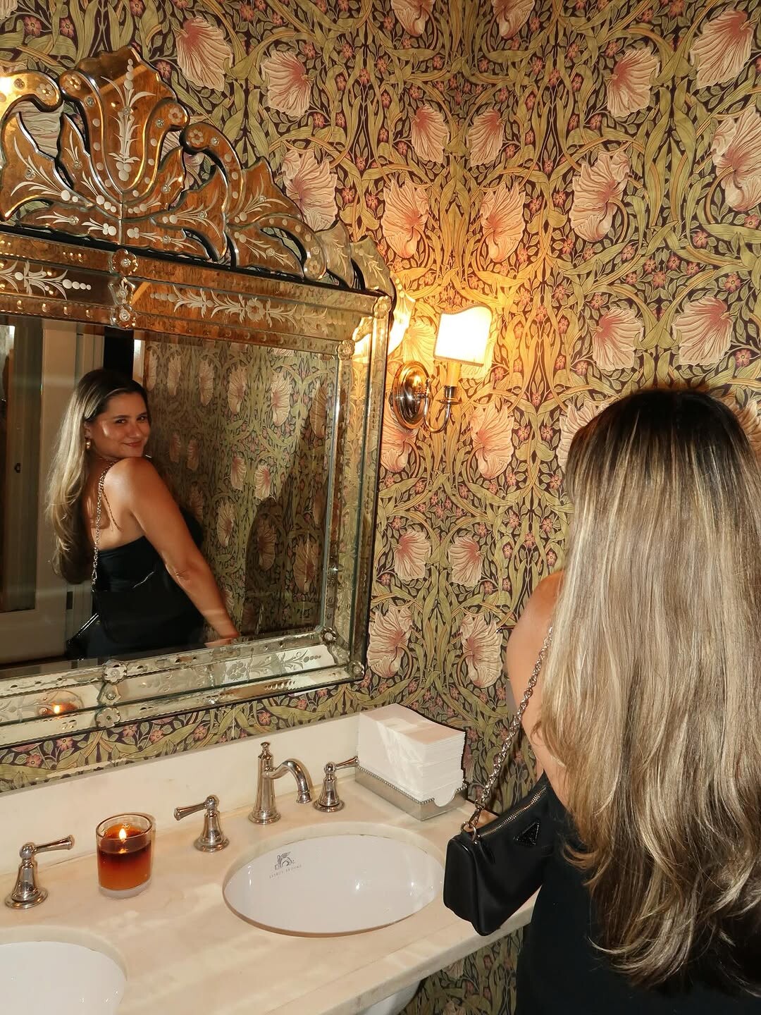 Chic bathrooms blend style and comfort. Floral wallpaper creates a sense of warmth and beauty. Patterns tell stories, evoking nature's grace. A woman with long hair smiles at her reflection. Confidence radiates from her. Black outfit adds elegance and sophistication. It contrasts with lighter surroundings, enhancing her presence.