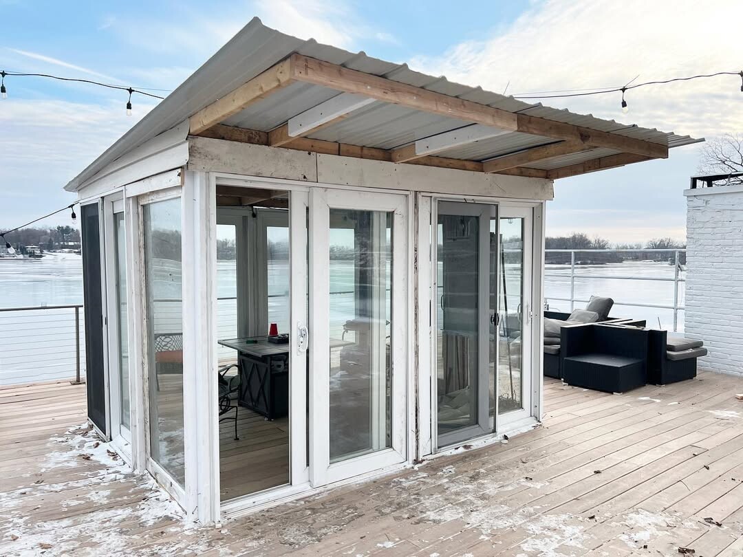 A modern gazebo stands out. Glass walls shine in sunlight. Slanted metal roof adds style. Wooden deck enhances charm. Overlooking calm water, it invites peace. Inside, a simple table and chairs create comfort. Perfect for relaxation, reading, or sipping tea.