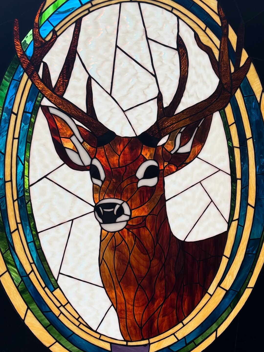 Stained glass art shines brightly. This depiction of a deer stands out. Antlers are impressive, reaching majestically. Colors burst with life—greens, browns, and golds. Every hue enhances natural beauty.