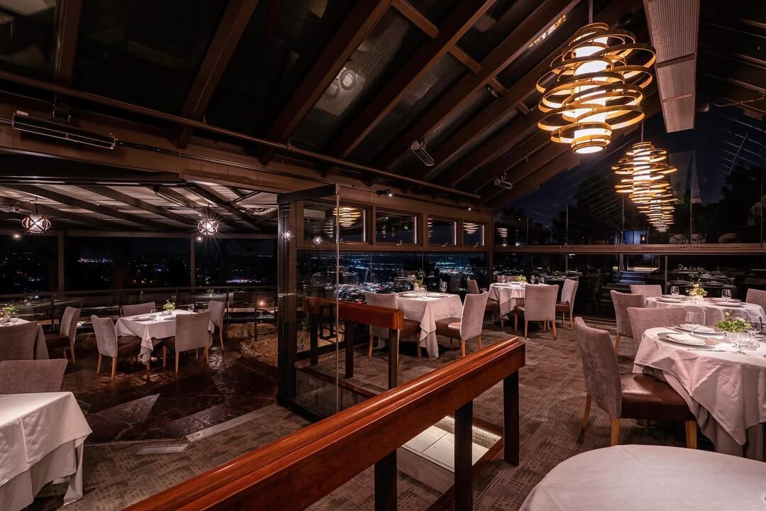 Elegant restaurant interiors set mood. Golden pendant lights shine brightly, creating warmth. Crisp white tablecloths offer a clean look. Plush chairs invite comfort and relaxation. Large windows showcase stunning city views at night, adding glamour.