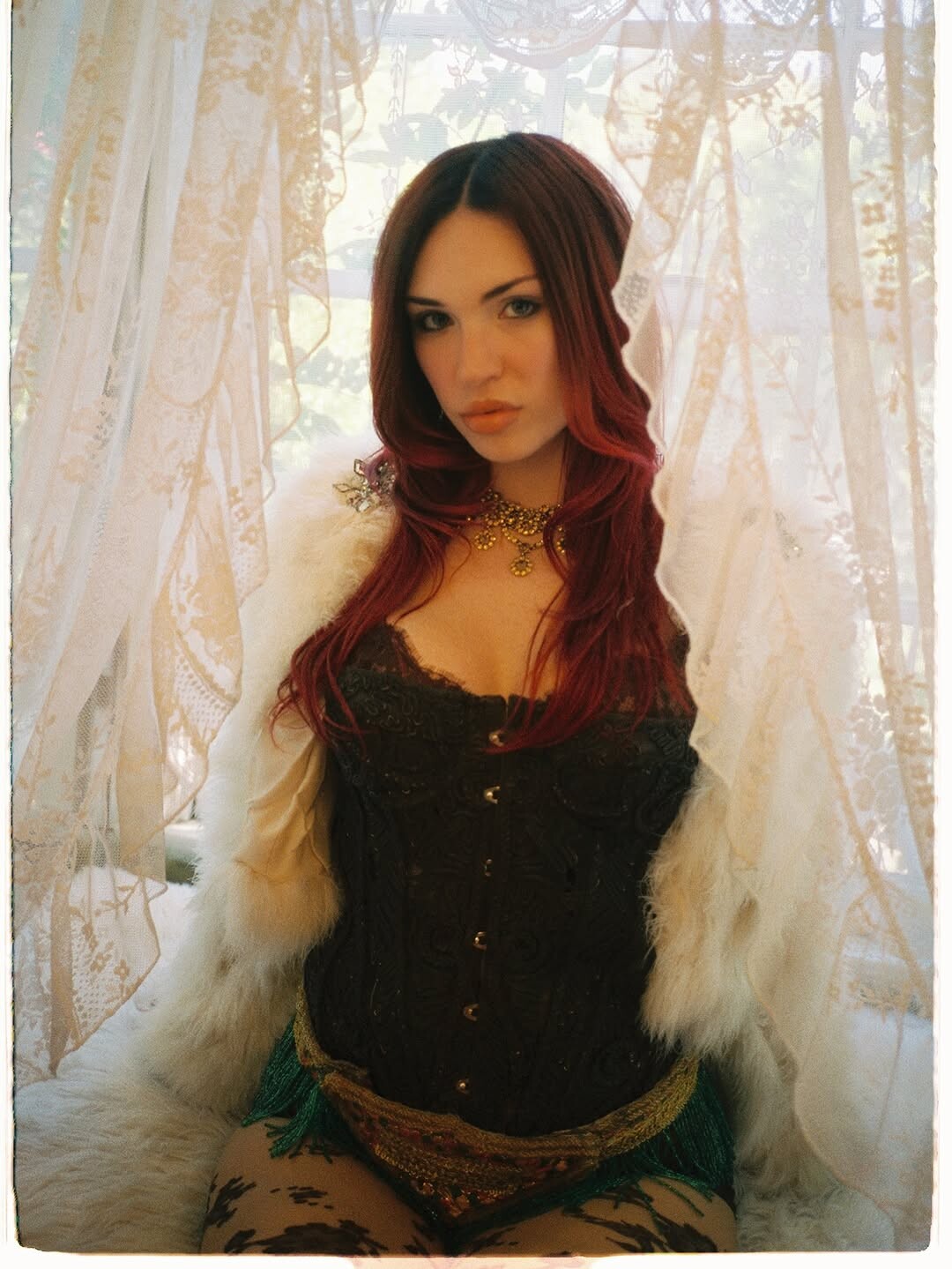 Such elements connect to themes of femininity and empowerment. Corsets historically symbolize control, yet here they reflect confidence. The gentle light contrasts with the bold color of her hair, highlighting duality in identity.