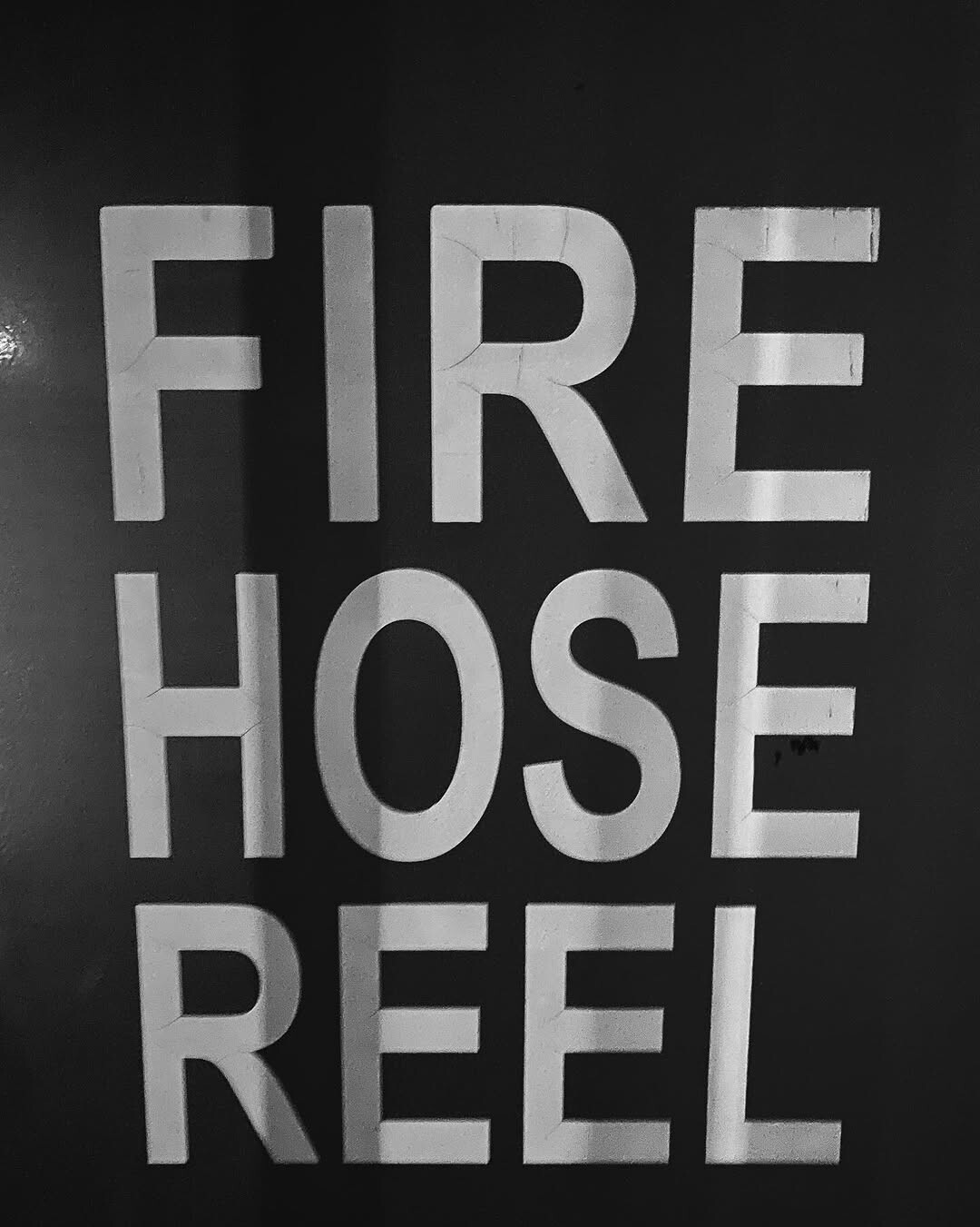Bold letters shout "FIRE HOSE REEL." White against dark. Clear. Direct. This image grabs attention. It stresses safety. Fire hose reels save lives. They provide quick access to water. Essential for fighting fires.