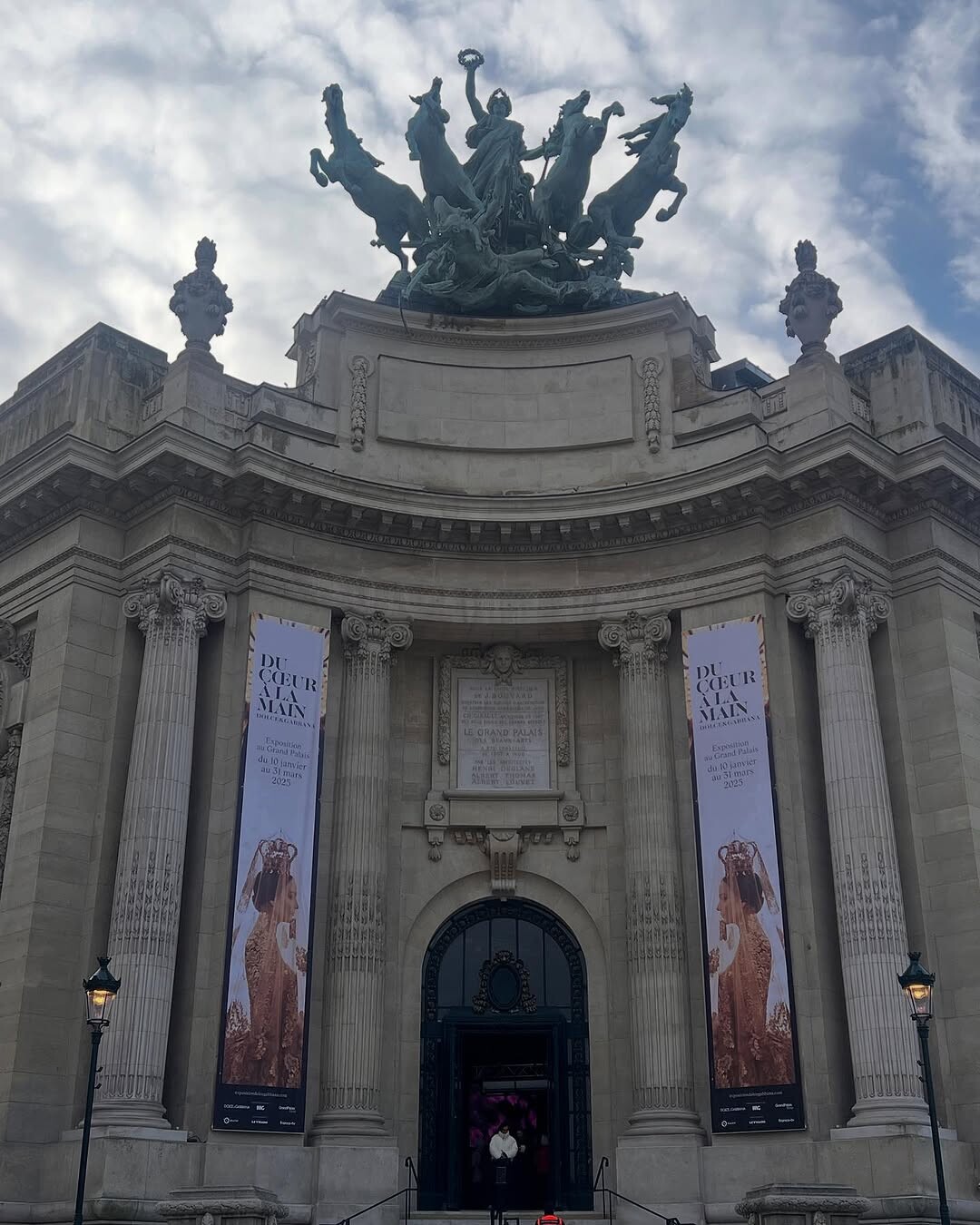 Ornate building stands tall. Grand entrance attracts attention. Intricate classical columns add elegance. A dramatic sculpture captures the eye. Chariot pulled by horses symbolizes power and triumph. Large banners announce "De cœur à main."