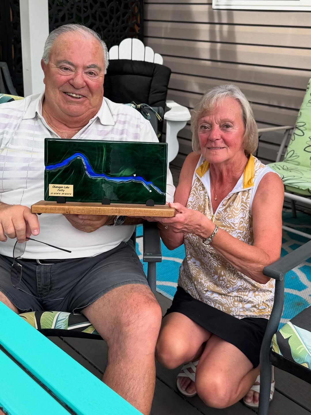 In an inviting outdoor scene, a smiling man and woman hold a decorative plaque. Their expressions show pride. The plaque features a blue and green design, symbolizing achievement. Colors evoke feelings of calm and creativity.