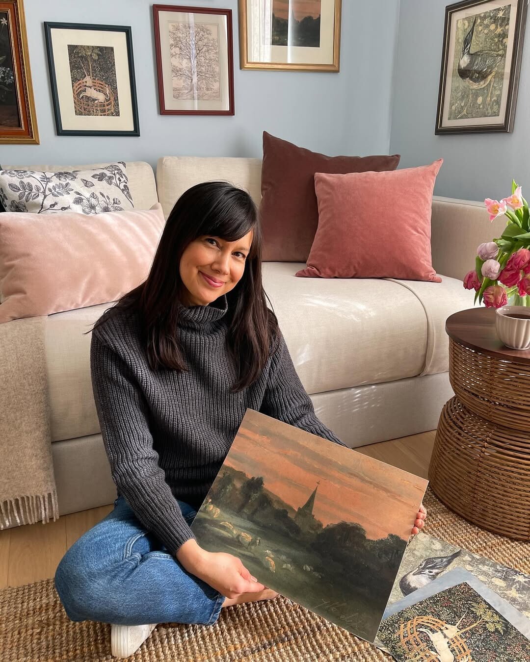In a cozy living room, warmth embraces. A woman with long dark hair smiles brightly. She holds a painted canvas. Vibrant colors depict a serene landscape. Nature elements shine: rolling hills, gentle skies, and calming waters.