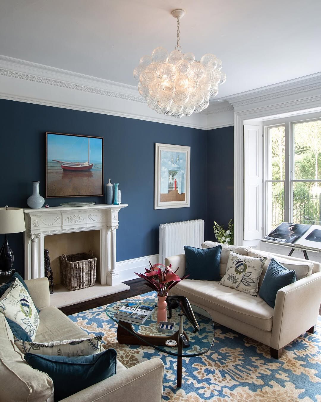 Rich blue walls create depth. They evoke calmness and elegance. Blue tones often symbolize tranquility. Contemporary chandelier adds sophistication. It serves as a focal point. Light fixtures shape mood. Brightness from large windows invites warmth. Natural light enhances the space, making it feel airy.