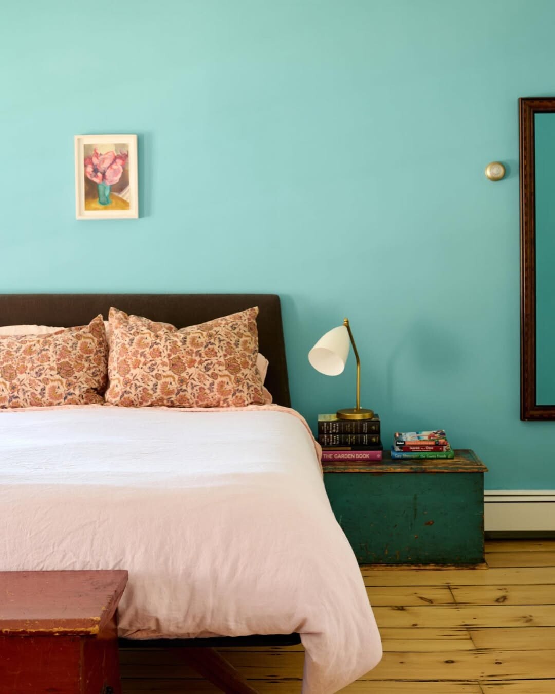 Cozy bedroom design shines here. Brown upholstered bed stands out. Patterns on pillows add style. Soft pink bedspread feels inviting. Vibrant turquoise wall creates energy. Color choice impacts mood. Turquoise is fresh and lively.