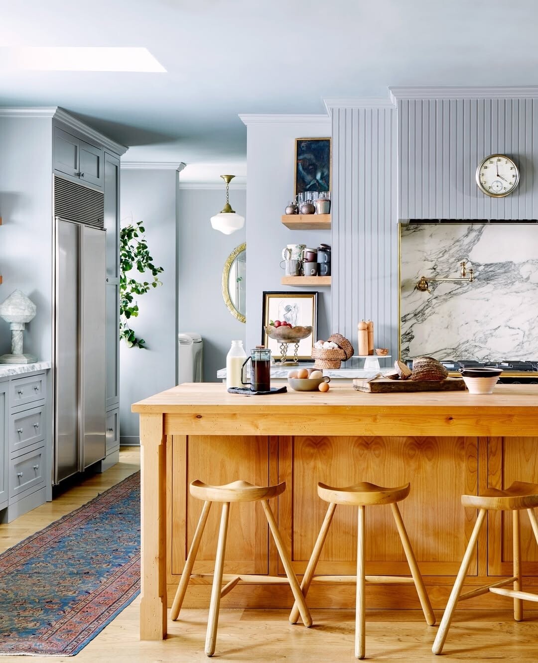 Modern kitchens often blend style and function. This kitchen shines with a light blue palette. Blue promotes calmness. The inviting wooden island stands out. It’s practical and stylish — perfect for gatherings. Three stools invite friends and family to sit.