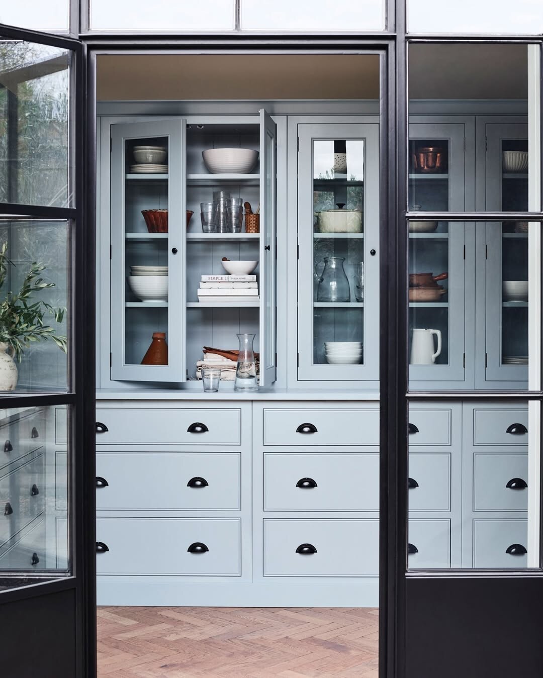 Soft blue cabinets bring calm. They invite warmth. Glass doors show off dishware and cookbooks. Organized spaces feel good. A tidy kitchen is key to cooking success. Black handles contrast nicely with blue. This adds a modern touch. Wooden floors ground the design, creating a cozy atmosphere.