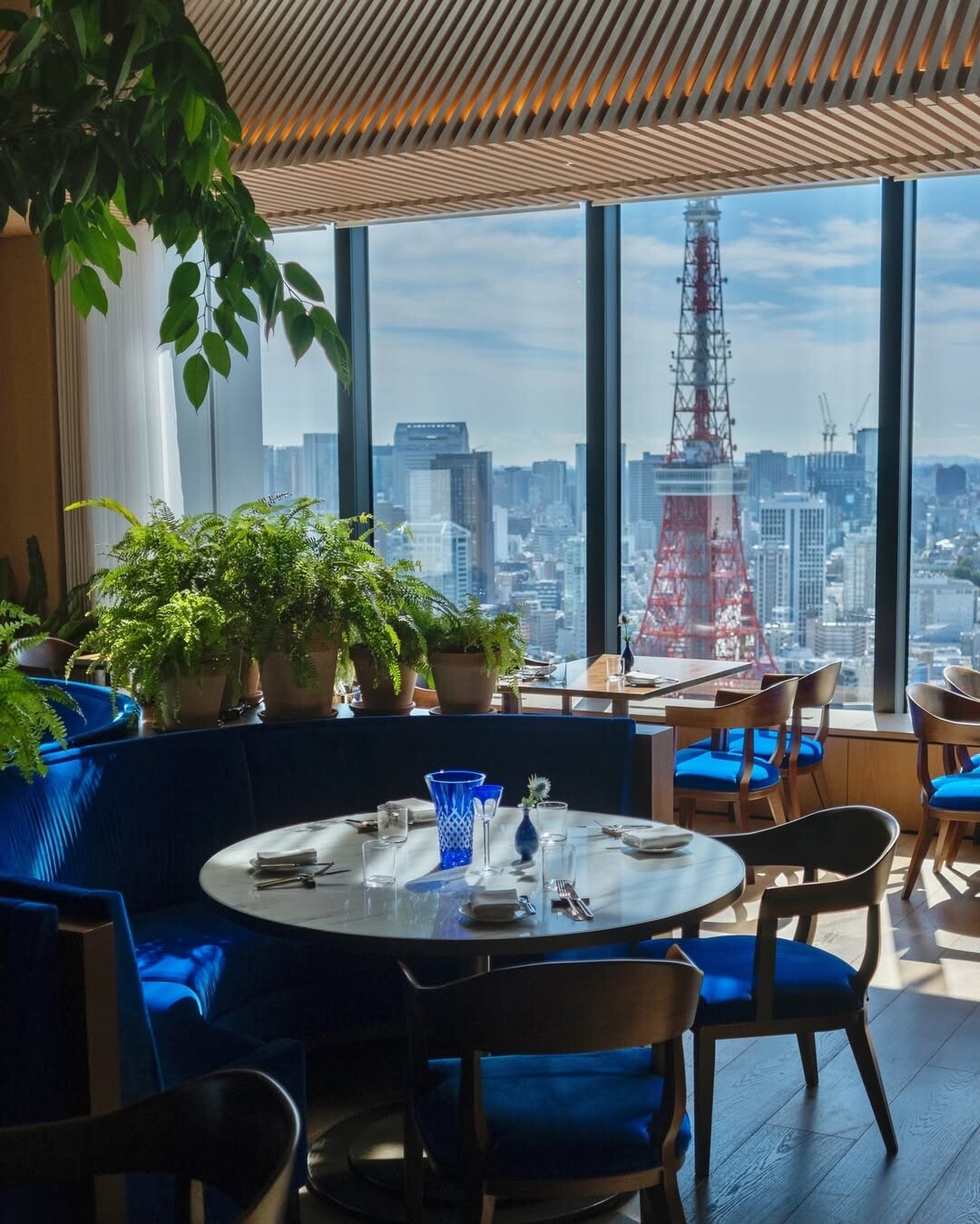 Vibrant blue seating stands out. It invites diners to relax and enjoy. Round table suggests intimacy. Perfect for shared meals. Large windows open up to a breathtaking view. Tokyo Tower shines against the urban skyline. This mix of nature and city creates harmony. Green plants soften the space, adding life. They remind us of nature's importance in design.