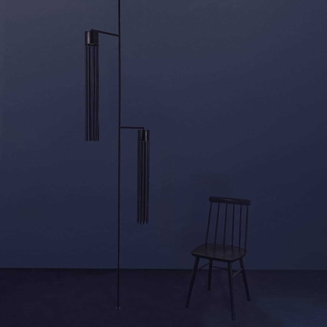 Dark blue walls create a strong backdrop. They set a mood. The sleek black lamp, hanging from a slender pole, draws attention. Its design is modern and functional. Light shines down, illuminating the space below.