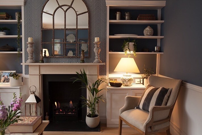 Cozy interiors create warmth. This living room shines with style. A sleek fireplace catches the eye. Flanking it, elegant candlesticks add charm. Above, a large mirror with a herringbone pattern reflects light and enhances space. Organized shelves display decorative items, showcasing personality and taste.