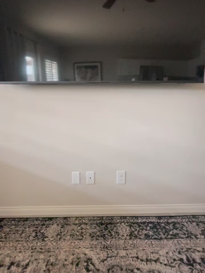 Large reflective television dominates space. It catches light beautifully. Reflections add depth. Positioned above wall, it serves as a focal point. Flanking electrical outlets suggest functionality. Easy access for devices.