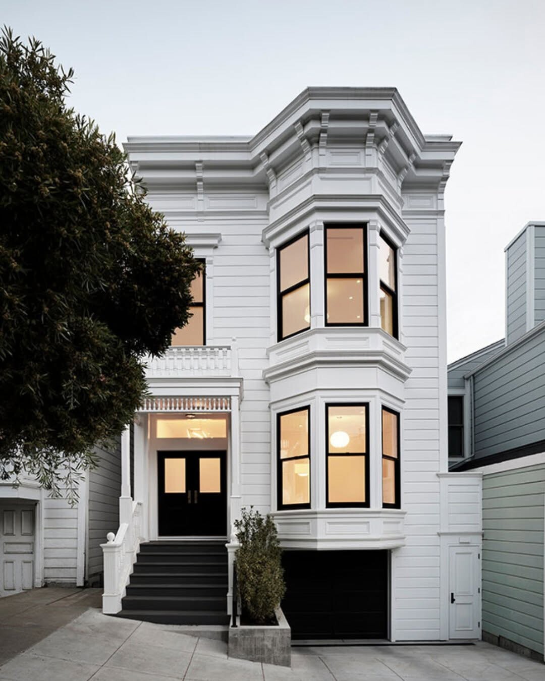 Modern Victorian architecture stands out. White facade gleams. Angular bay windows catch light. Tall black trim adds elegance. Steps lead up to a sleek entrance, inviting and warm. Neatly trimmed greenery frames the house, enhancing its charm. Gray wooden siding contrasts beautifully.
