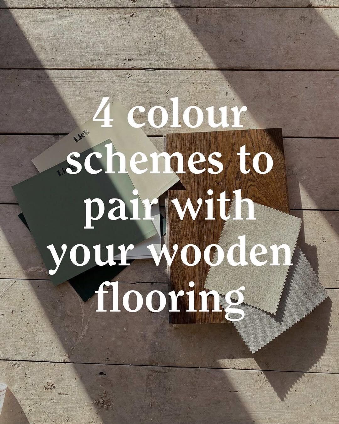 Color and texture play vital roles in interior design. Swatches on light wooden flooring show harmony in choices. Four color schemes suggest versatility. Soft blues and greens can bring calmness. Bold reds or oranges add energy.