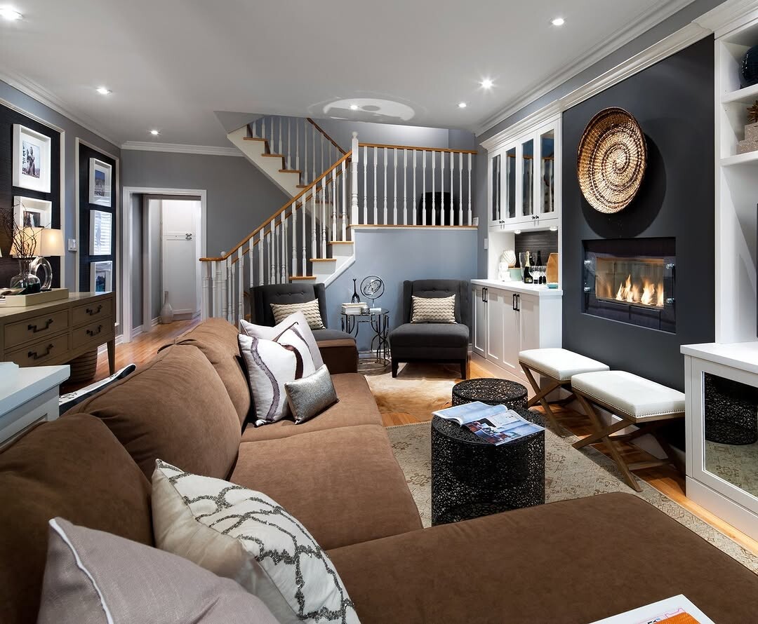 Stylish living room shines with warmth. Brown sectional sofa invites relaxation. Decorative pillows add color and comfort. Electric fireplace sparks interest. Nestled in dark wall, it’s a focal point. Cozy ambiance created by soft ceiling lights.