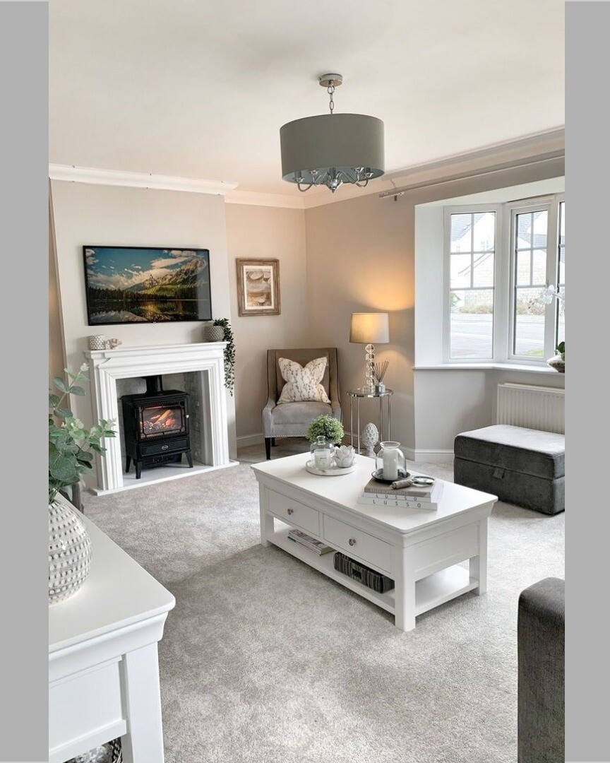 Cozy living room. Soft grey carpet underfoot. Stylish white coffee table stands out. Decorative items add personality. Plush armchair invites relaxation. Small lamp provides gentle light. White fireplace features modern electric insert, blending comfort with technology. Wall-mounted television shows a serene landscape, enhancing tranquility. Natural light floods in through large windows, creating warmth and openness.