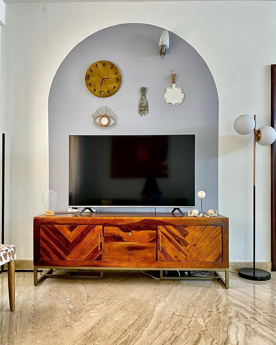 Modern living rooms blend style and function. Here, a flat-screen television takes center stage on a gray wall. A round wall clock and mirror add depth and interest. These elements show balance between technology and art.