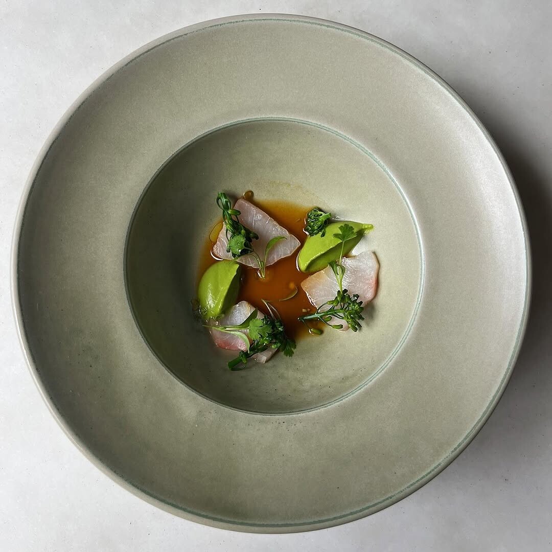 Elegant presentation shines in this dish. Fresh fish slices lay beautifully in a light green bowl. The glossy brown liquid adds depth. It looks rich and flavorful. Vibrant green herbs pop against the brown. Lime segments offer a burst of color and zest.