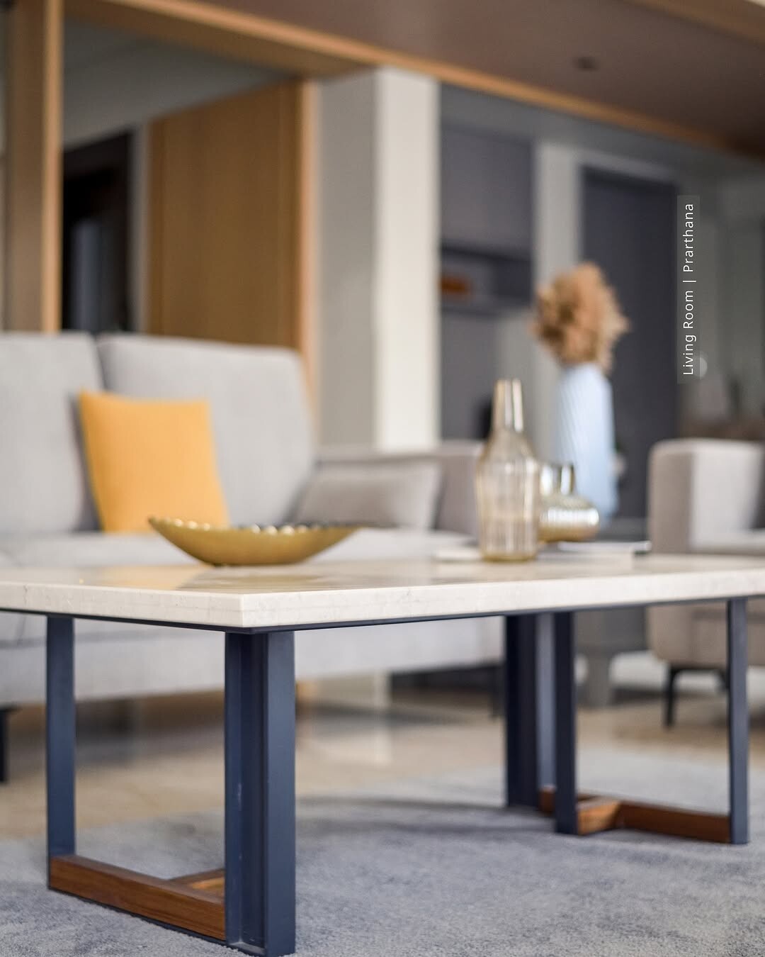 Stylish living room. Modern coffee table shines. Light marble top contrasts with dark metal legs. Decorative bowl adds charm. Soft, neutral sofas invite relaxation. Cozy vibe created. Blurred figure in background suggests life and warmth.