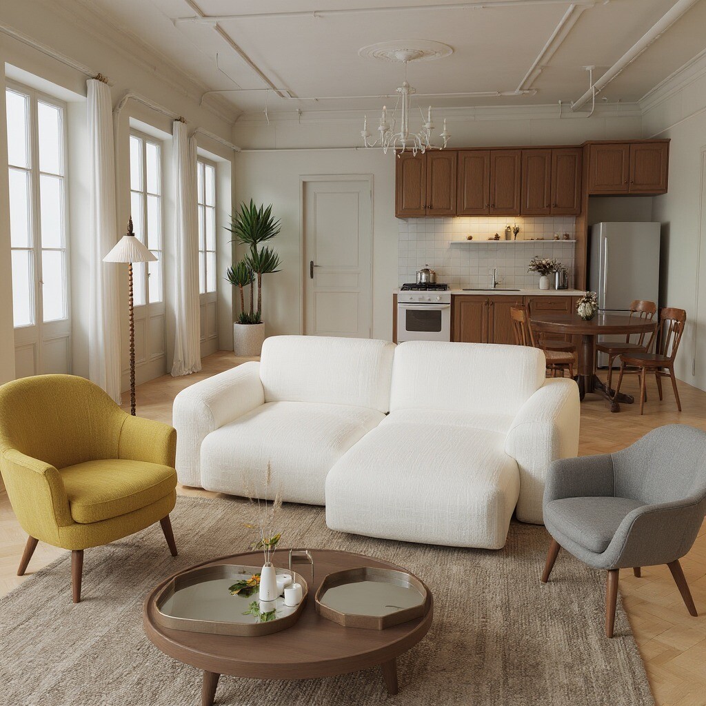 Cozy and inviting. A modern living space shines with bright colors and natural light. White sofa creates a calm base. Round coffee table adds a playful touch. Yellow armchair stands out, bringing warmth. Gray armchair balances the palette with subtlety. Light walls enhance openness, making the room feel larger. Large windows invite sunlight, promoting a cheerful atmosphere.