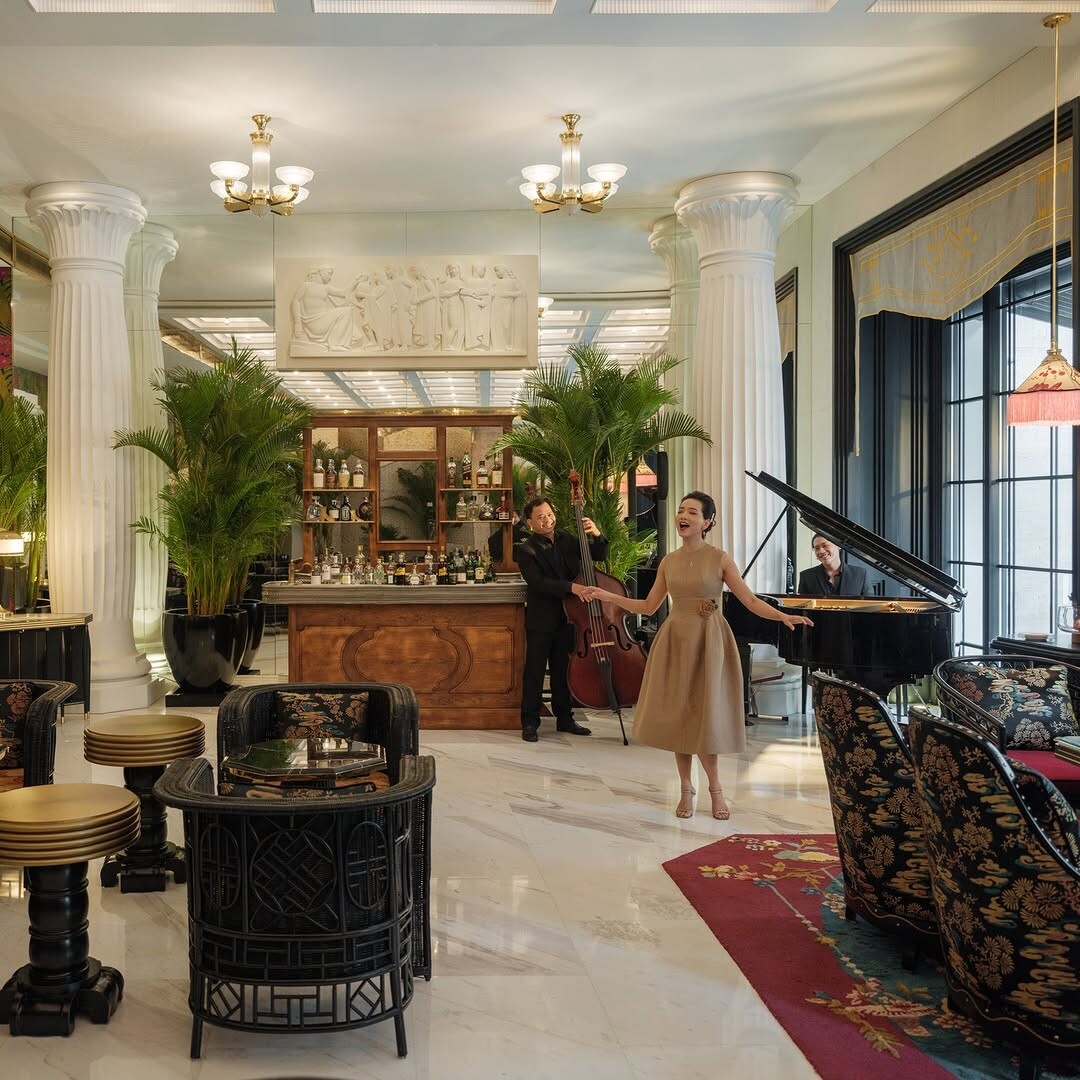 Lounge scene radiates elegance. High ceilings tower above. Tall pillars stand strong, framing space. Lush green plants add life. A stylish woman dances near grand piano. Musicians create a rich sound. Together, they fill room with music. Exquisite decor shines, from plush seating to intricate details.