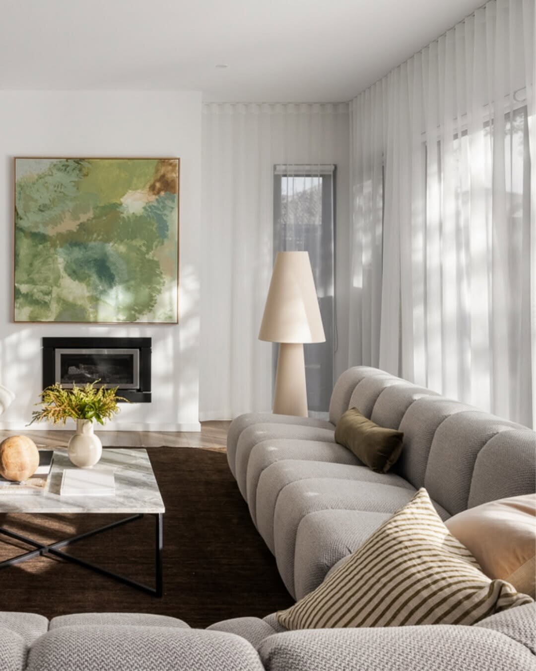 Floor lamp beside minimalist fireplace provides warmth. Soft lighting creates a cozy atmosphere. Sheer curtains filter natural light beautifully. They soften edges and enhance tranquility. Large abstract painting on wall captivates attention. Green tones connect to nature, promoting calmness.