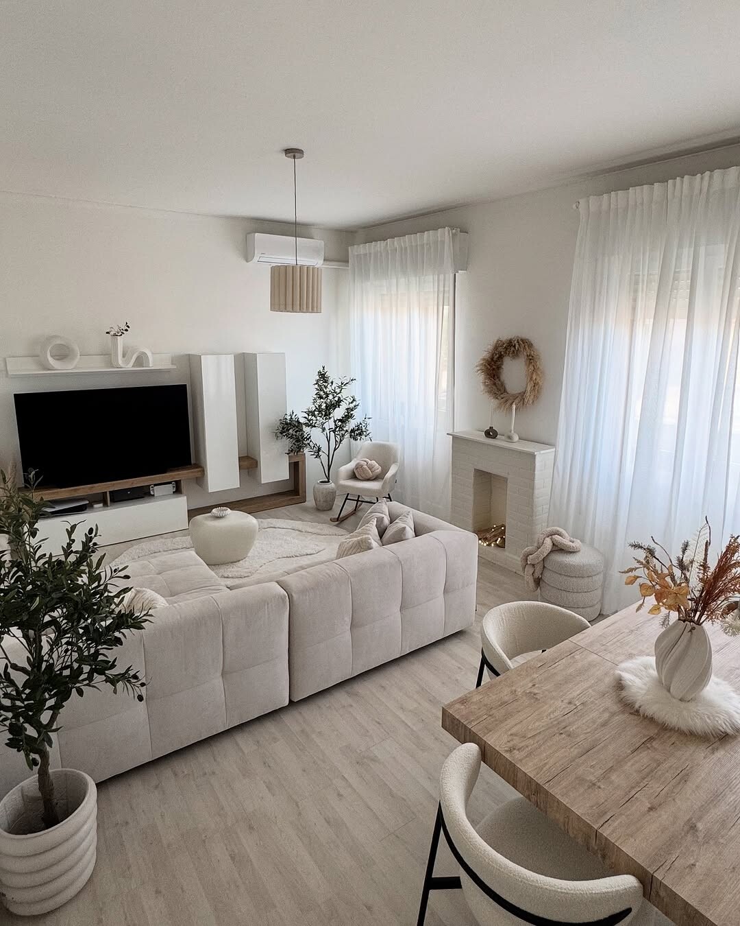 Minimalist living room shines. Cream-colored sectional sofa stands out. Soft pillows add comfort. White media unit keeps focus on TV. Large windows invite sunlight. Sheer curtains create a bright feel.