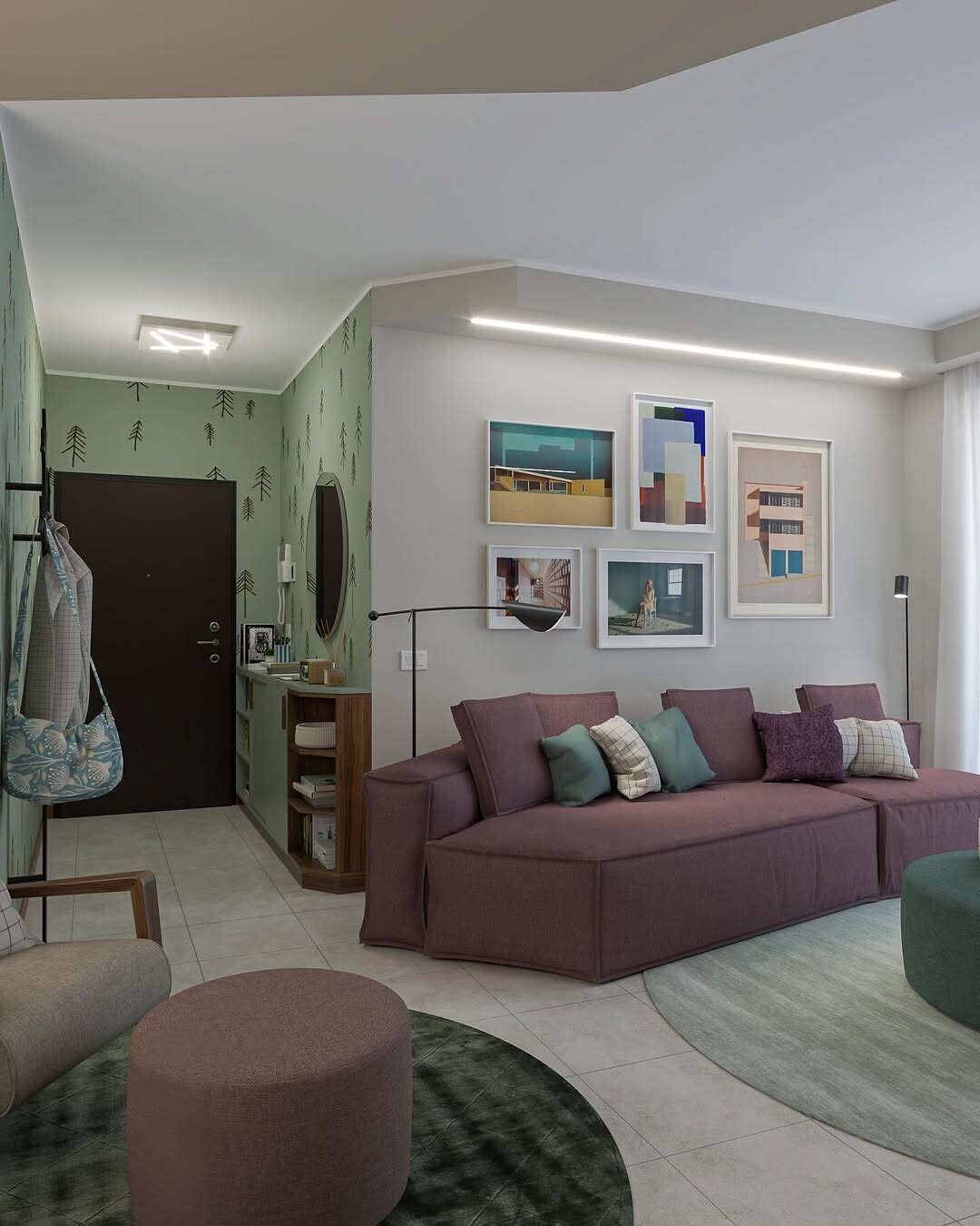Cozy living rooms create comfort. Deep purple sofas stand out. Color conveys warmth and invites relaxation. Cushions add texture. They make seating inviting, encouraging people to sit and chat. The round green rug grounds the space. It contrasts nicely with the sofa, bringing a fresh feel.