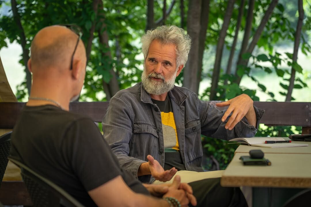 In a lush outdoor space, two men converse deeply. One man has a gray beard and relaxed clothes. He speaks with passion, hands moving. A notebook and smartphone sit on the table, tools for ideas. The other man listens closely, back turned. His focus shows engagement.