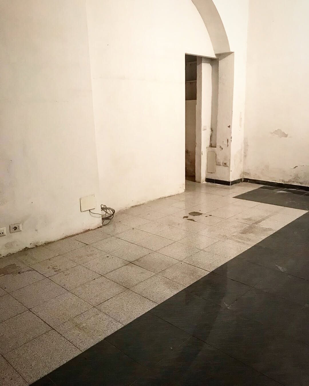Sparsely furnished room. Peeling white walls tell stories. They show neglect and time's passage. Large archway invites curiosity. It leads to another space. What secrets lie beyond? Floor tiles, a mix of dark and light. Stains reveal heavy use. Wear reflects daily life. Each mark has a tale.