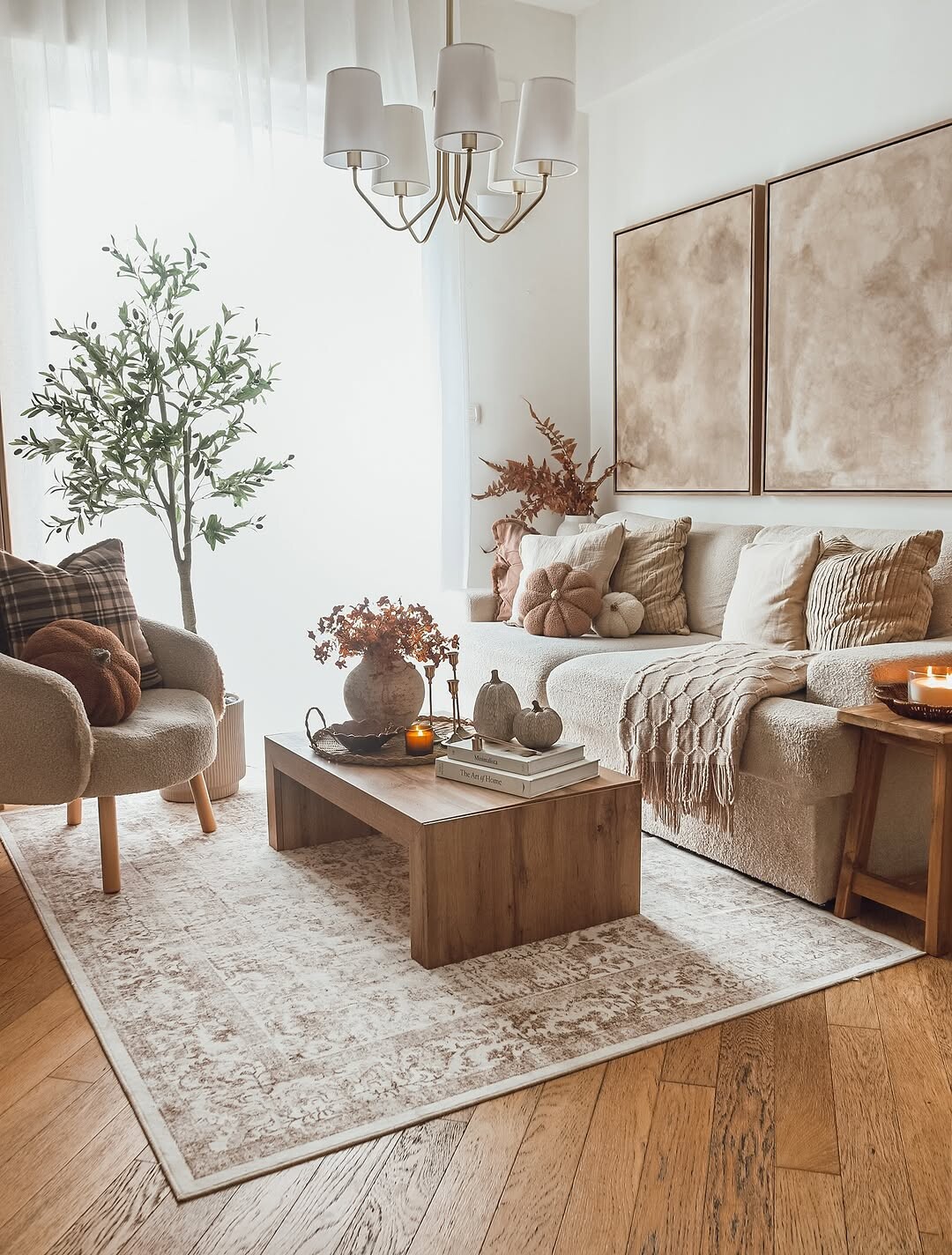 Cozy living rooms create comfort. This image shows one that excels in warmth and style. Plush beige sofa offers a soft place to relax. Cushions add color and texture, inviting people to sit down. Wooden coffee table showcases decorative items, adding personality. Area rug brings warmth to the wooden floor, creating a cozy feel.