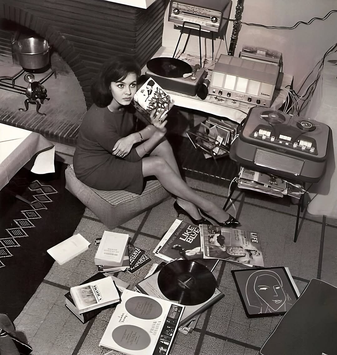 A cozy scene emerges. Young woman relaxes. Fitted dress hugs her figure. Floor cushion cradles her. Book held high, showcasing engagement with literature. Scattered records and magazines tell stories of diverse interests. Vintage reel-to-reel tape recorder adds nostalgia. It symbolizes a love for audio culture, a connection to past eras.