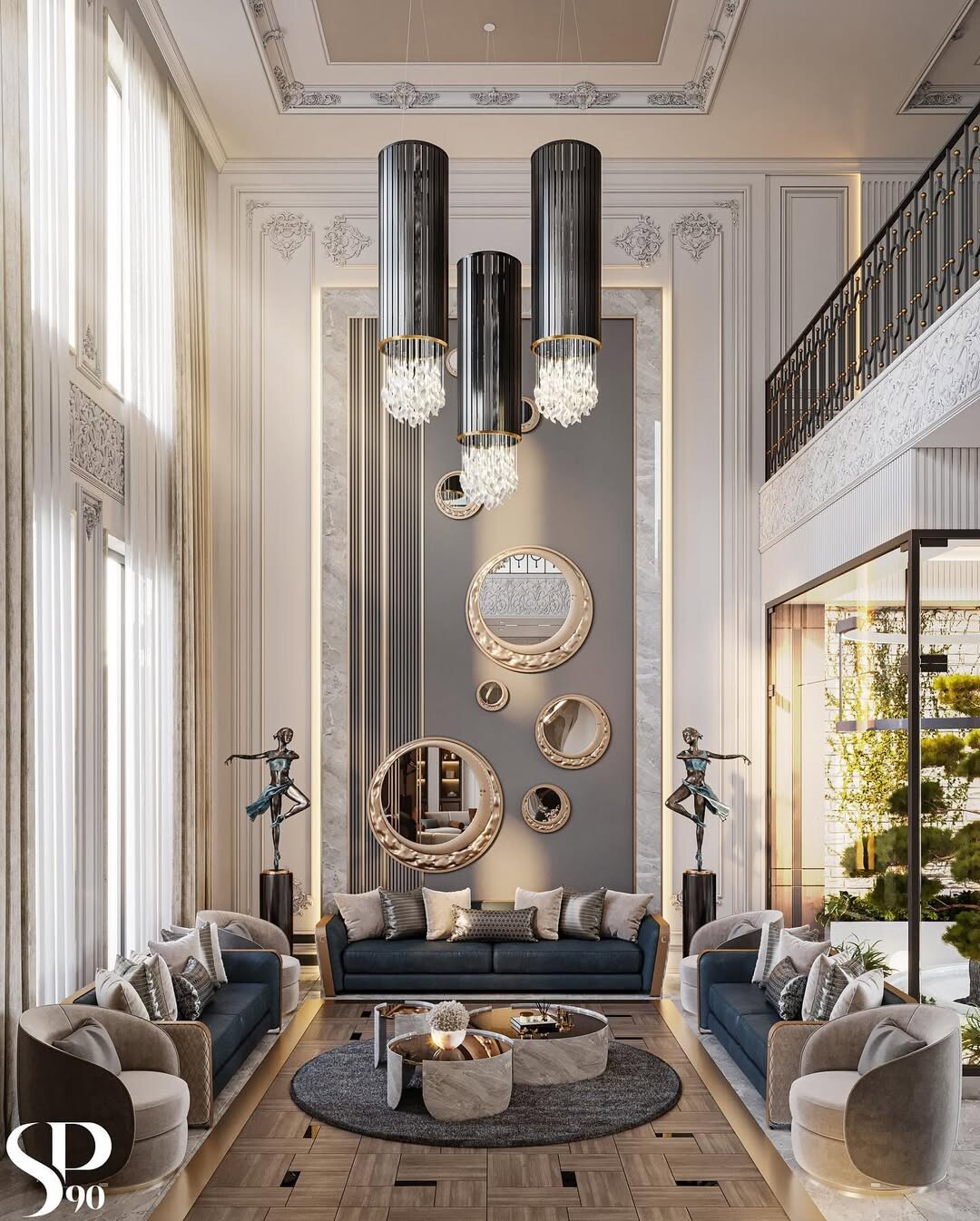 Luxurious living rooms often reflect personal style and comfort. High ceilings here create a sense of spaciousness. Intricate designs add elegance. Dark blue sofas stand out. Their color brings depth to the room. A circular coffee table offers a cozy gathering spot. Plush rugs add warmth, inviting people to relax.