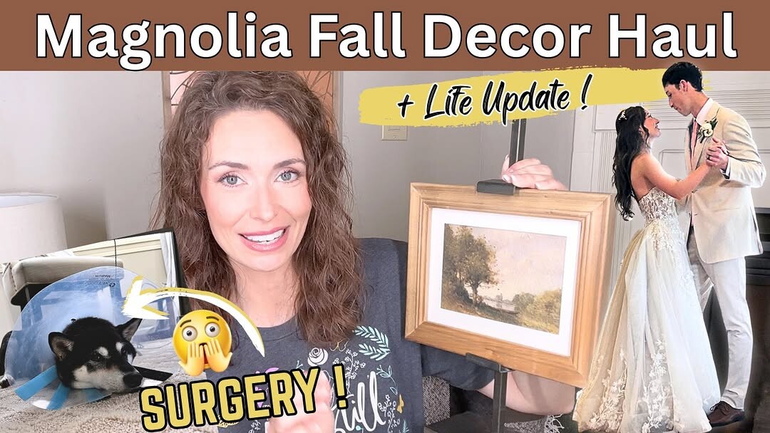 Woman with curly hair. Smiling. Holding a framed painting. Joyful moment captured. Surroundings filled with fall decor. Warm colors. Cozy vibes. A cute dog adds charm. Highlights companionship and love. Wedding photo hints at life milestones. Important memories shared. Text overlay indicates a haul and life update—surgery mentioned. This adds depth. A glimpse into personal journey.