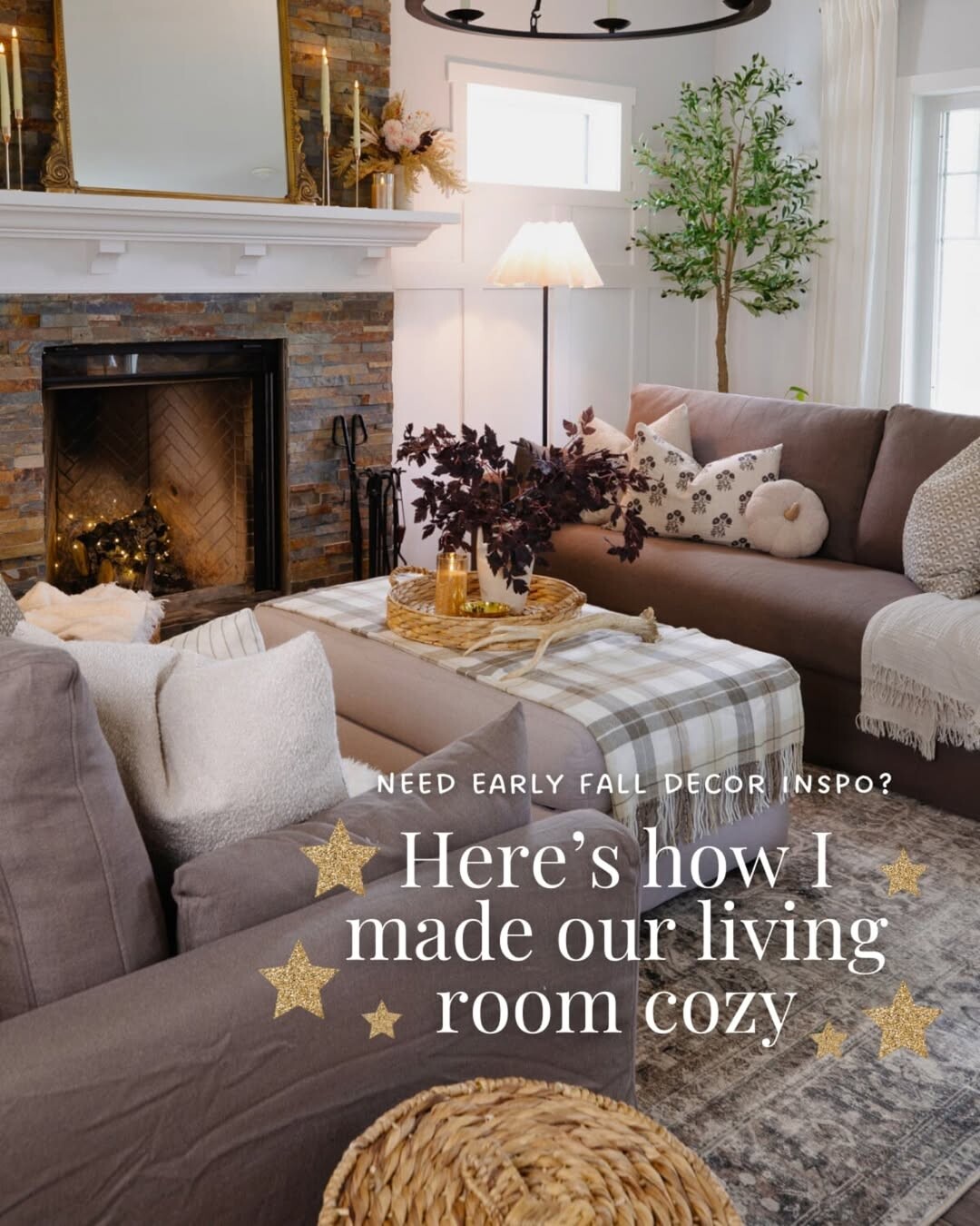 Rustic stone fireplace serves as a focal point, grounding the space. Large windows flood the room with natural light. Early fall décor elements enhance the inviting vibe.