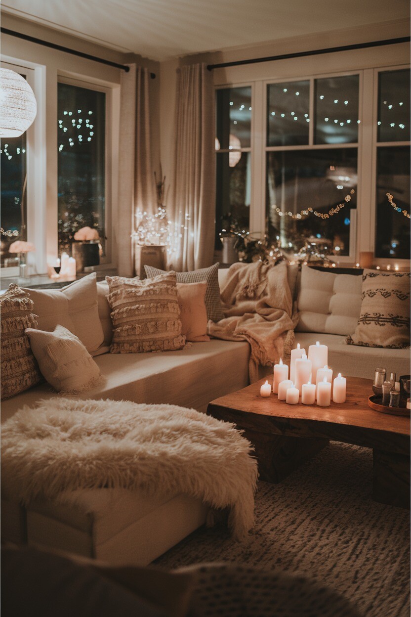 Cozy living room vibes. Warm light glows softly. Cushions and throw blanket invite comfort. Sectional sofa offers space for relaxing. Wooden coffee table stands strong, surrounded by flickering candles. Each candle adds warmth, creating a serene setting. Glowing fairy lights twinkle through large windows.