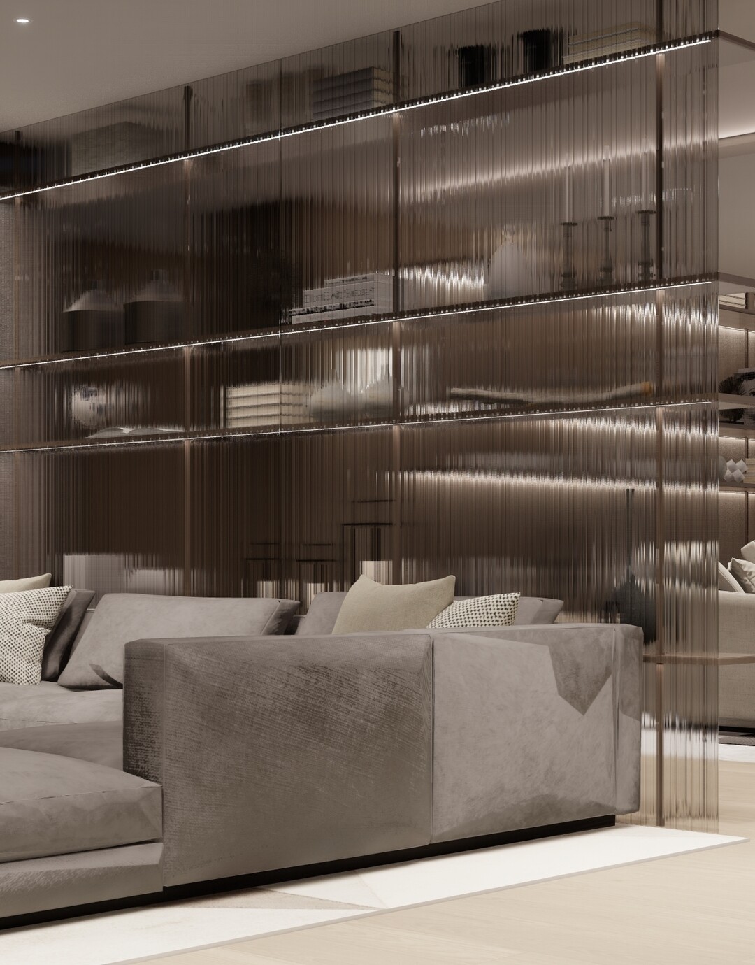 A modern living space shines with elegance. Plush gray sectional sofa draws attention. Decorative pillows add pops of color and comfort. Semi-transparent partition enhances airiness. It separates areas without closing off space. Organized shelves display minimalist decor. Soft ambient lighting creates warmth. These elements work together to promote relaxation and serenity.