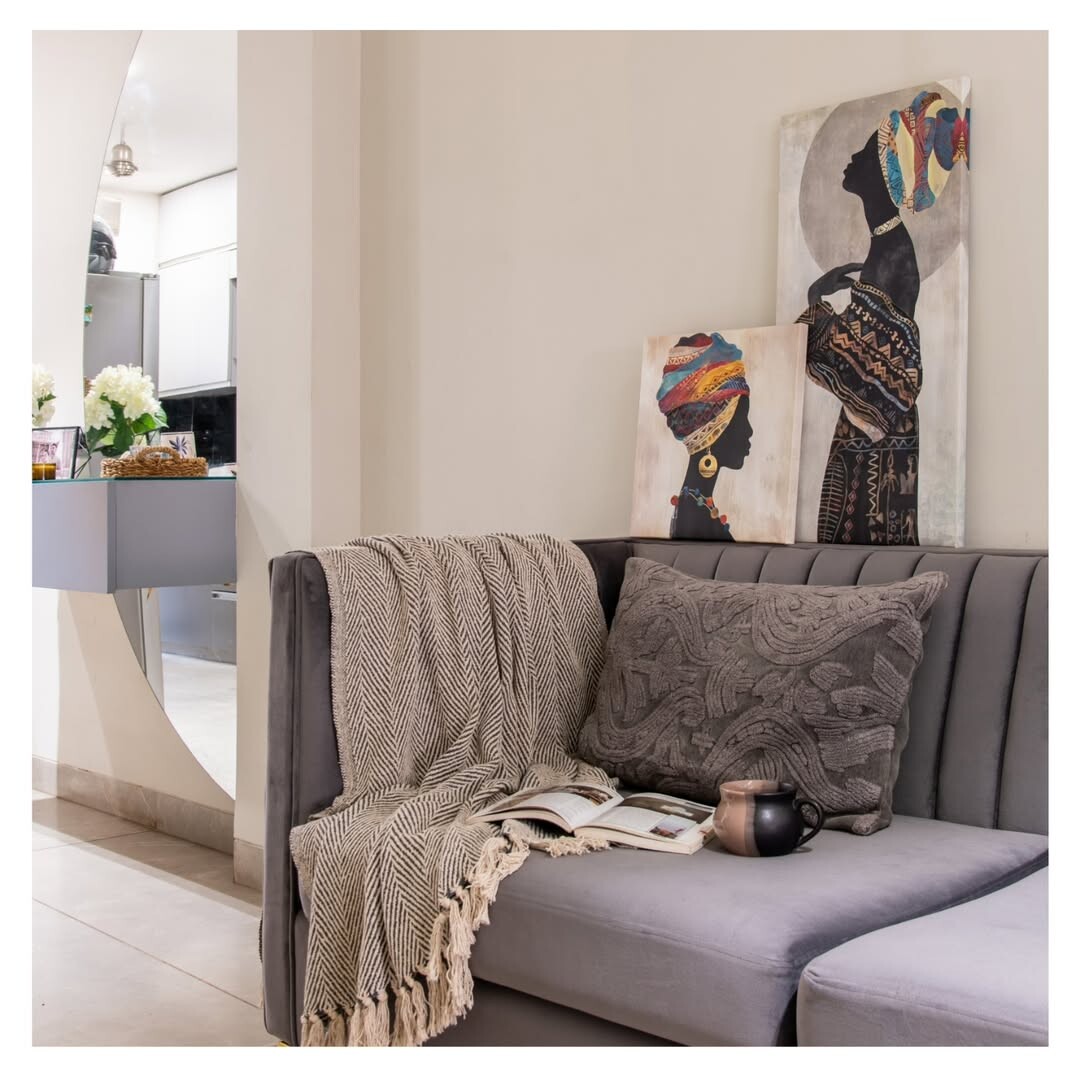 Cozy living space stands out. Gray sofa feels modern yet inviting. Textured throw blanket adds warmth. Decorative pillows bring color and comfort. Cultural artwork showcases silhouetted figures. These pieces tell stories. They reflect identity and heritage. Art enriches the room, sparking conversation.