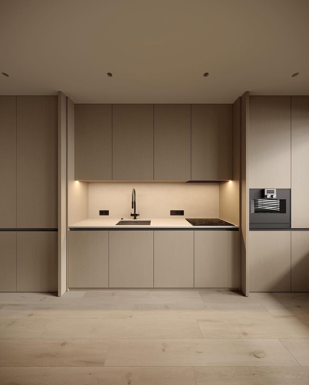 Sleek and minimalistic design shines here. Light wood cabinets create warmth. White countertops offer a bright contrast. Under-cabinet lighting adds both function and ambiance. It enhances the clean lines and modern feel. Black fixtures pop against neutral tones. The faucet and stovetop draw eyes with their boldness. This kitchen encapsulates modern design principles. Functionality meets style seamlessly.