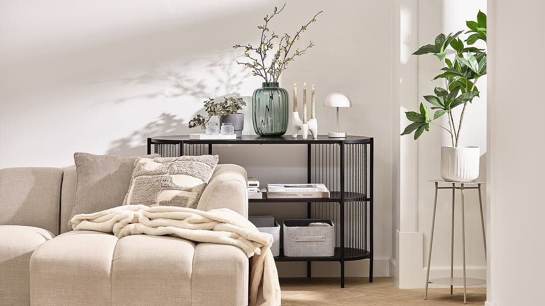 Stylish corner. Light beige sofa invites comfort. Cozy throw adds warmth. Modern black shelf stands strong. It holds decorative items: a green vase with branches, candles, and a lamp. Each piece adds character.