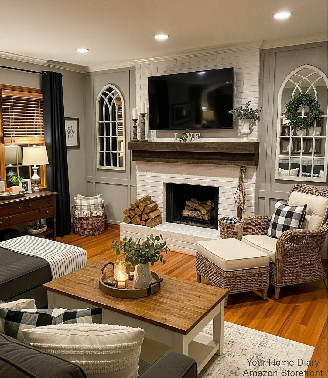 Cozy living rooms create warmth. Modern design shines here. Gray palette offers calmness. White-brick fireplace stands out. It draws attention with its rustic charm. A wooden mantel adds character. Flat-screen TV blends technology with comfort. Decorative greenery brings life into space. Plants improve air quality and mood.