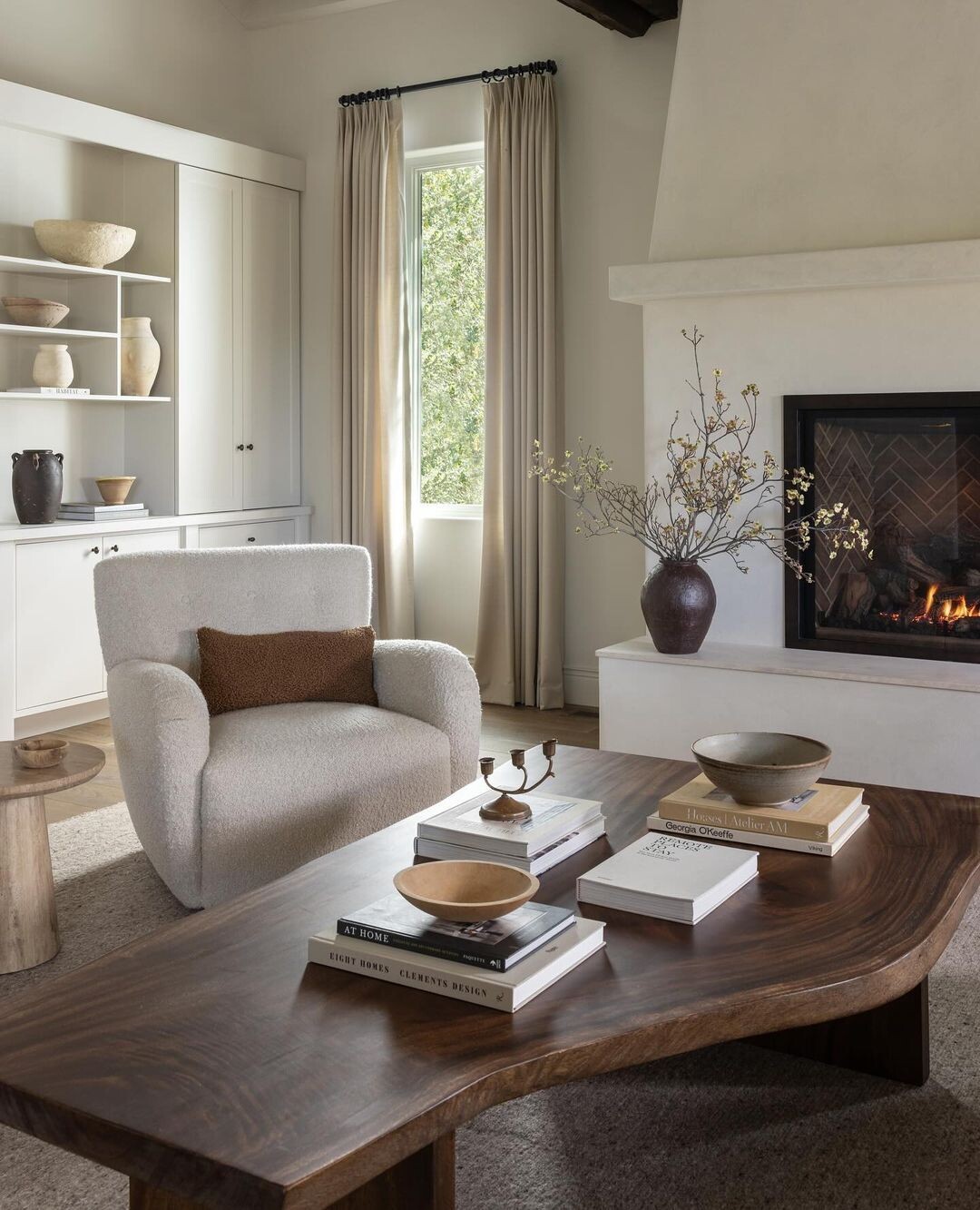 Cozy living rooms create warmth and connection. Plush armchair invites relaxation. Light colors add brightness. Brown cushion offers a subtle contrast. Unique wooden coffee table shows creativity. Books and bowls arranged artfully suggest personal stories. Modern fireplace with herringbone pattern adds texture and charm. Large window brings in natural light, enhancing openness. Soft curtains frame the view, creating a tranquil atmosphere. Neutral palette promotes calmness, while minimalist decor keeps focus on essentials. Ceramic vases on the shelf add elegance without clutter. This space illustrates balance between comfort and style. It reflects contemporary design trends, emphasizing simplicity and functionality. Cozy living rooms nurture relationships and foster a sense of belonging.