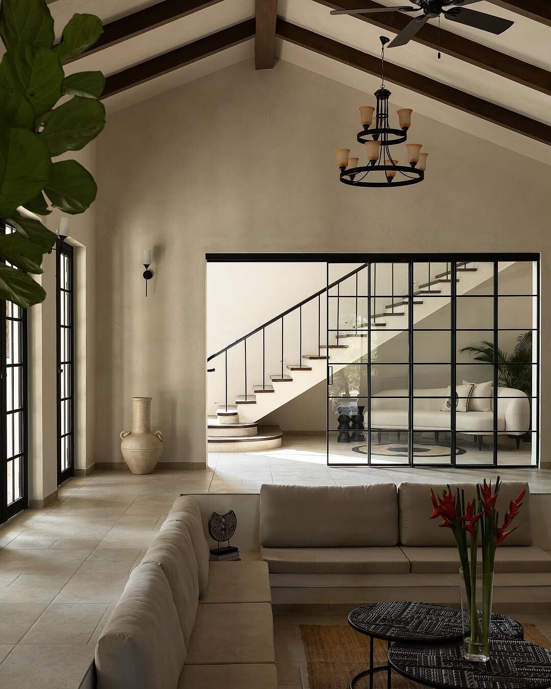 Chandeliers shine brightly, serving as focal points. They blend elegance with functionality. Large black-framed glass doors open to a staircase. This design choice enhances flow and accessibility.