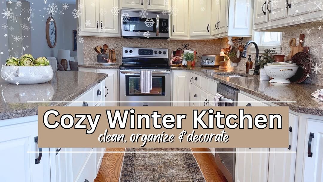 Decorative text overlay emphasizes ideas of tidiness and seasonal charm. Winter decorations add a touch of festivity. They remind us to embrace seasonal changes. This kitchen embodies functionality and aesthetics. It shows how design choices impact mood and efficiency. Overall, a blend of beauty and practicality. Perfect for family gatherings or quiet evenings. A true reflection of warmth and organization in culinary spaces.