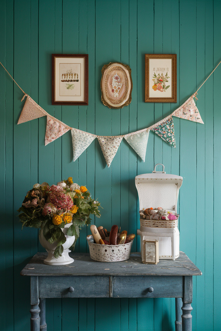Bring a festive spirit to your home with vintage-inspired fabric bunting! Using scraps of old fabrics or even thrifted pieces, you can cut triangles and string them together. This colorful décor is perfect for parties, or you can hang it in your child’s room for a whimsical touch. The blend of patterns and textures makes it uniquely charming!